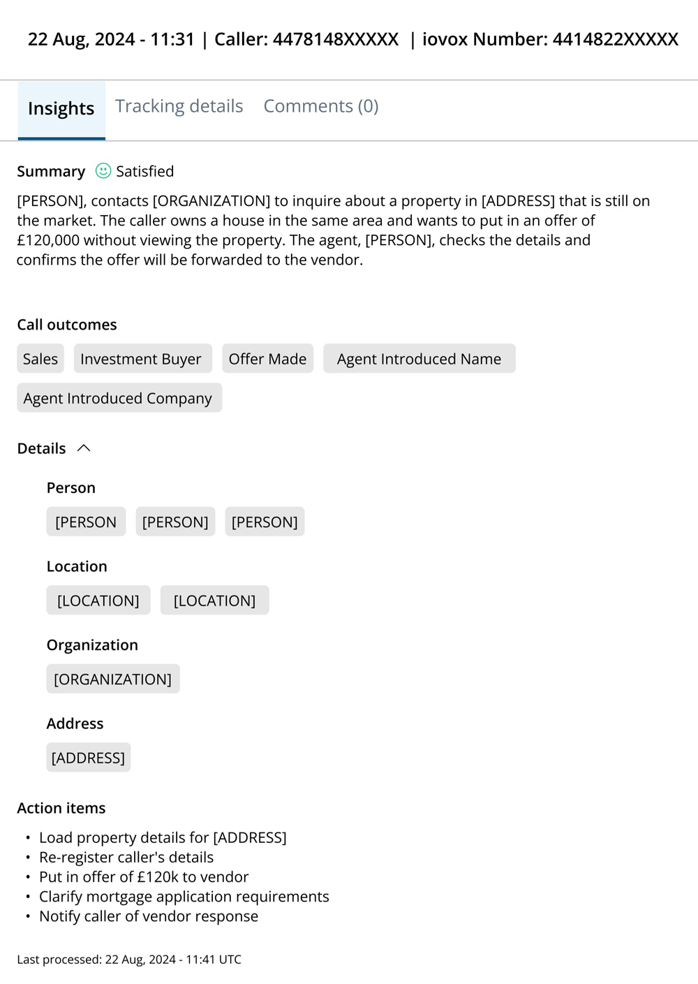 - Custom insights: extract specific information from voicemails unique to your needs.